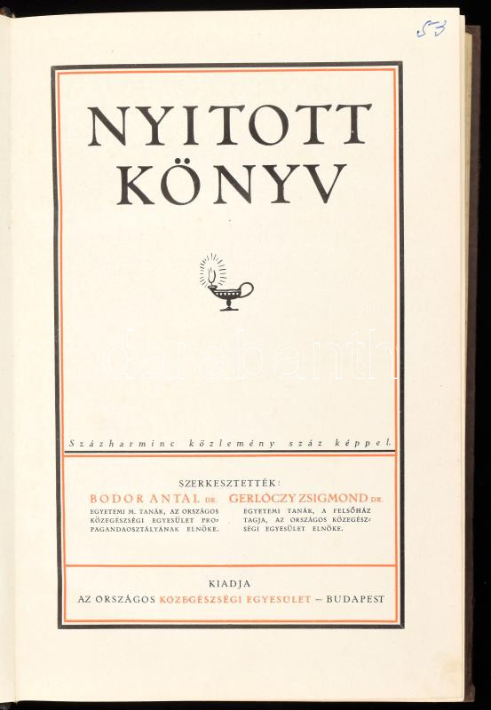 Nyitott könyv. Százharminc közlemény száz képpel. Szerk.: Bodor Antal, Gerlóczy Zsigmond. Bp., [1928], Országos Közegészségi Egyesület (Kir. M. Egyetemi Ny.), 320 p.+ 27 t. Fekete-fehér és szÃnes képekkel illusztrálva. Kiadói aranyozott félbÅ‘r-kötés, jó állapotban, minimálisan sérült borÃtóval.