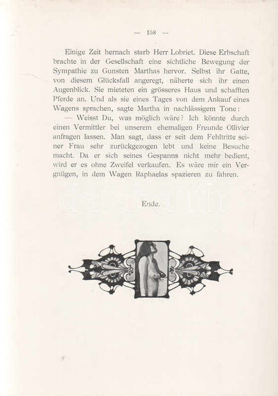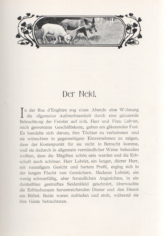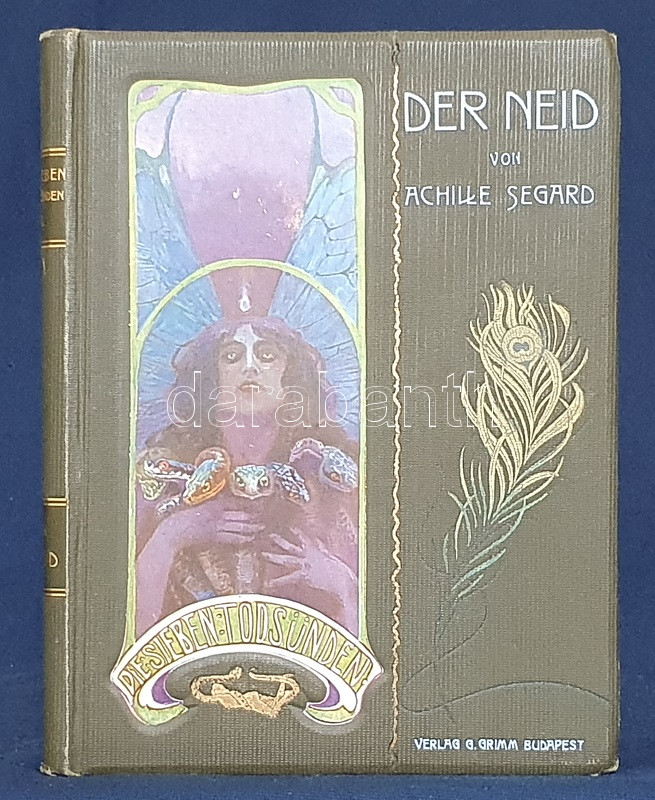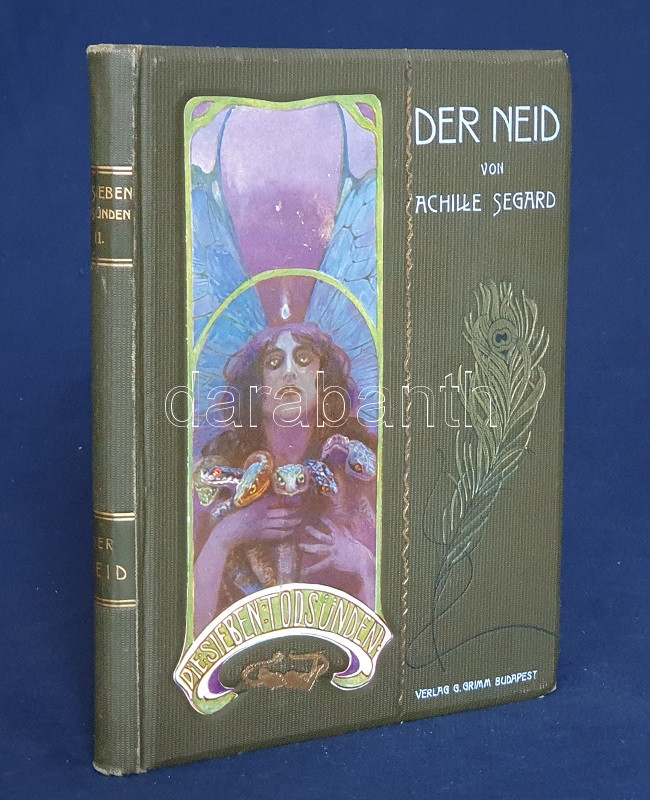 Segard, Achille: Der Neid. Illustriert von Arthur Scheiner. Budapest, [1904]. Gustav Grimms Verlag 158 p. Első német kiadás. Oldalszámozáson belül 12, tónusos, egész oldalas és számos szövegközti illusztrációval. Achille Segard (1872-1936) francia író, drámaíró társadalmi regényét oldalszámozáson belül a cseh illusztrátor Arthur Scheiner tizenkét tónusos, egész oldalas, erotikába hajló szecessziós illusztrációja díszíti, a regényszöveget kísérő számos szövegközti grafika mellett. (Die sieben Todsünden.) Aranyozot, festett, illusztrált, szecessziós, vaknyomásos kiadói egészvászon kötésben (Gottermayer Nándor, Budapest). Jó példány.