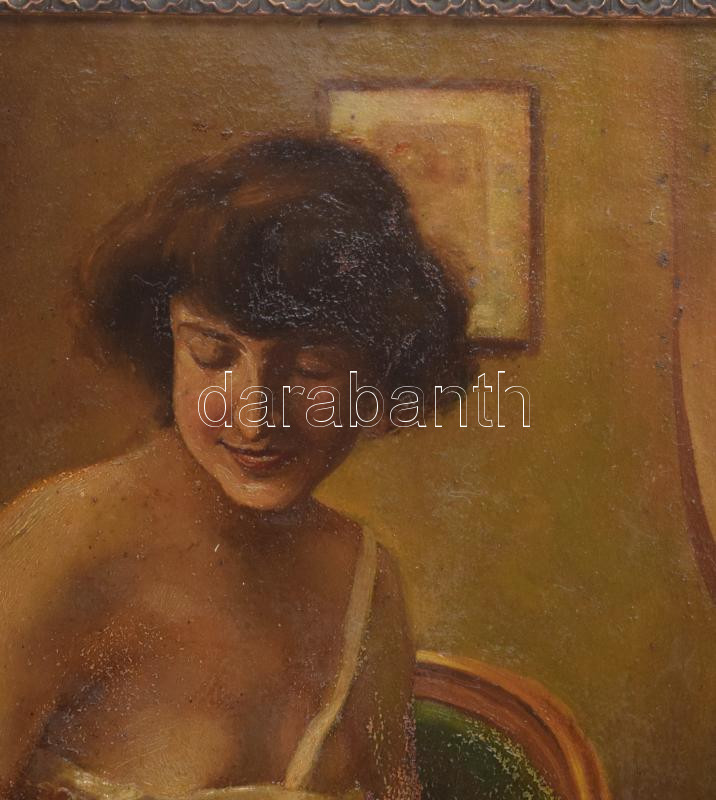 Jelzés nélkül, XX. sz. eleje: Harisnyát felhúzó, lergén öltözött hölgy... https://www.darabanth.com/en/468-Online-auction/468.0/Paintings-and-graphics/Paintings-and-graphics-quot-signedquot-or-quot-without-signquot-~1000002/Jelzes-nelkul-XX-sz-eleje-Harisnyat-felhuzo-lergen-oltozott-holgy-Olaj-karton-Kor~II3167238