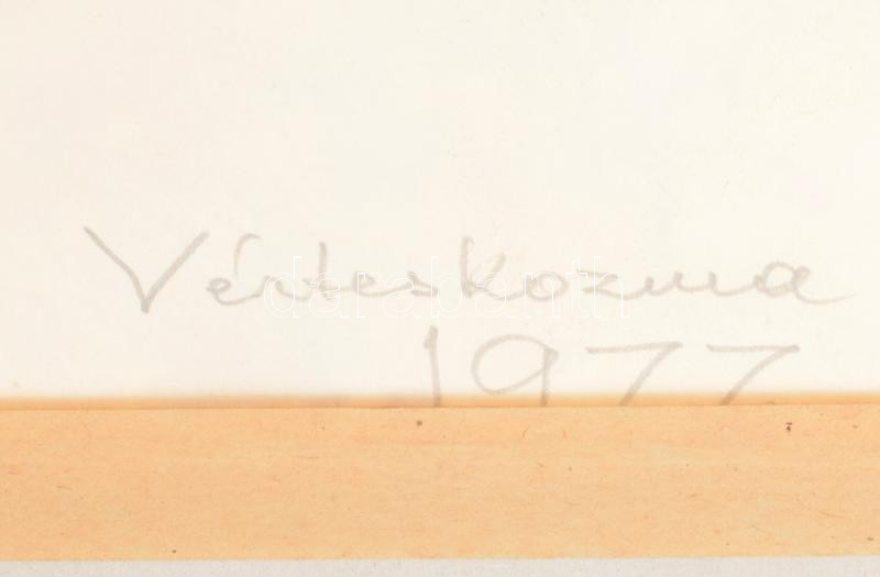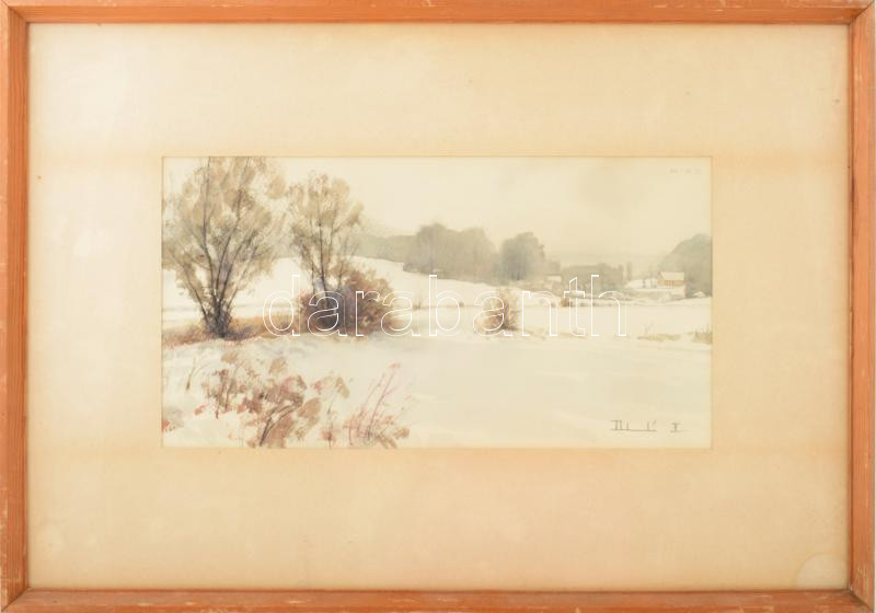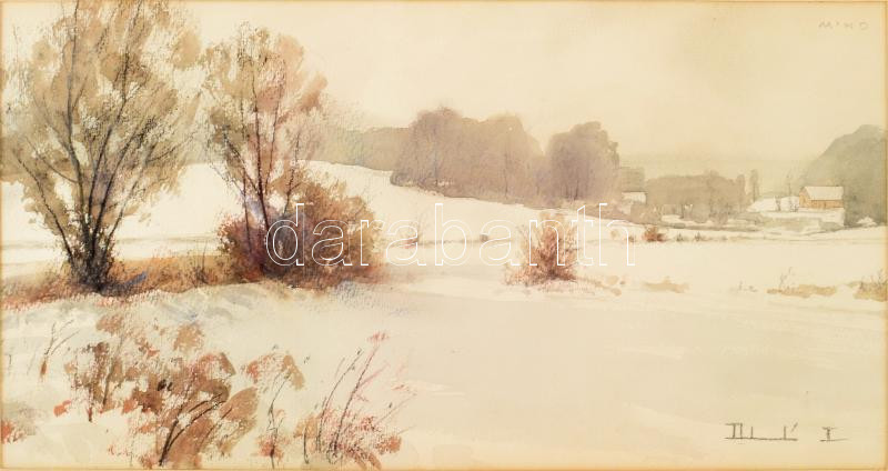 Dobroszláv Lajos (1902-1987): Vérteskozmai táj, 1977. Akvarell, ceruza, papír, jelezve jobbra lent, hátoldalán autográf felirattal (Vérteskozma, 1977), üvegezett fakeretben, 23×44,5 cm.