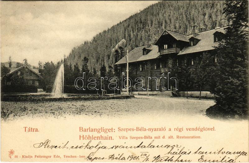 Description: 1901 Barlangliget, Höhlenhain, Tatranská Kotlina (Magas-Tátra, Vysoké Tatry); Szepesbéla nyaraló a régi vendéglővel. Feitzinger Ede No. 86. / Villa Szepes-Béla mit d. alt. Restauration / villa, restaurant, fountain