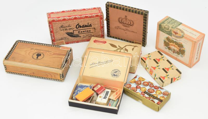 8 darab retro reklámos doboz, klf méretben, karton, fa, közte szivaros dobozokkal