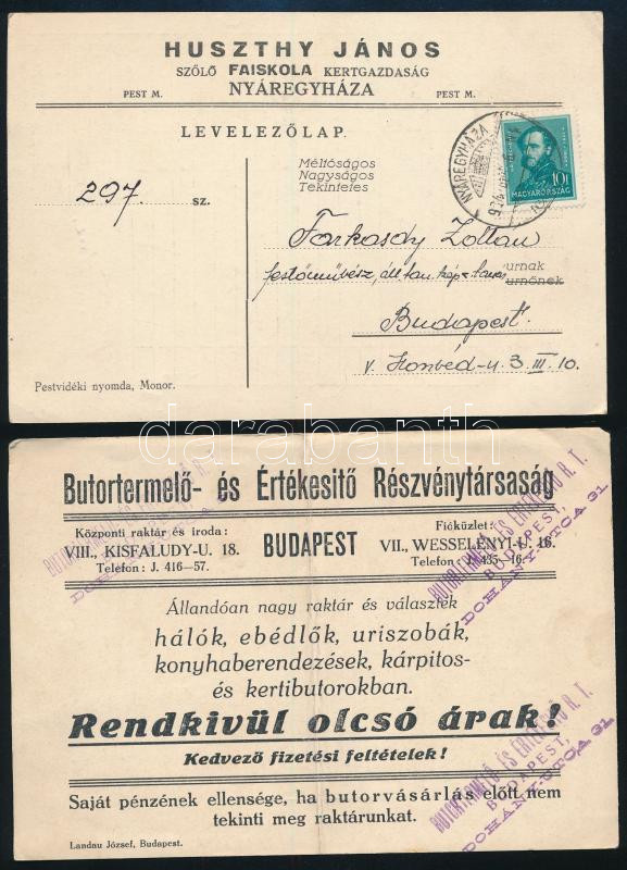 Description: cca 1930 Bútortermelő- és Értékesítő Rt. Budapest reklámlap + 1934 Huszthy János faiskola, szőlő- és kertgazdaság Nyáregyháza fejléces üzleti levelezőlap, Farkasdy Zoltán festőművésznek címezve