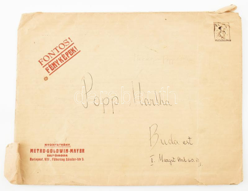 cca 1930 Metro-Goldwin-Mayer sajtóiroda, Bp., VIII., Főherceg Sándor-tér 3., papírboríték tartalom nélkül, sérült, 24x30,5 cm