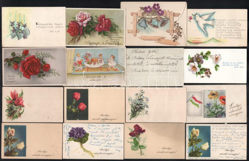 21 db vegyes üdvözlőkártya (névnapi, stb.), részben kézzel írt sorokka...