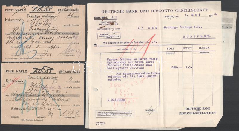 Description: 1925-1930 Deutsche Bank und Disconto-Gesellschaft számlája Az Est Lapok kiadóhivatala részére + 2 db Az Est pénztári utalvány, az egyik a Korona infláció idejéből