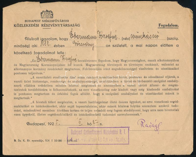 1925 Budapest Székesfővárosi Közlekedési R.-T. (BSZKRT, Beszkárt) fogadalom, fejléces papíron, kisebb lapszéli szakadásokkal