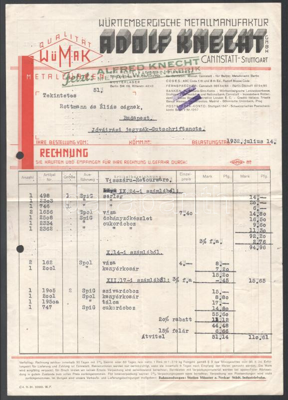 1932 Württembergische Metallmanufaktur Adolf Knecht GmbH német vállalat jóváírási jegyzéke a budapesti Rottmann és Éliás cégnek, magyar nyelven