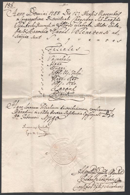 Description: 1790 Kalatay Ferenc (1722-1795) nagyváradi püspök, II. József udvari papja autográf aláírása egyházi dokumentumon, címeres, papírfelzetes viaszpecséttel.