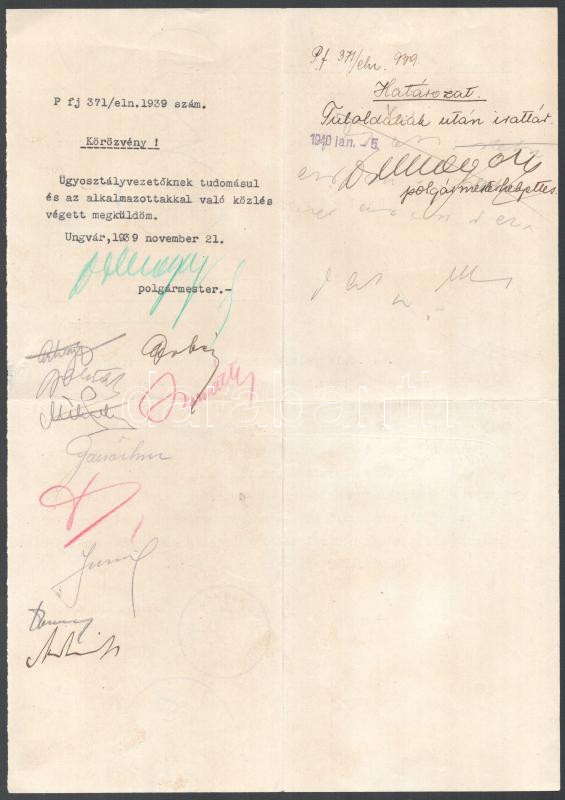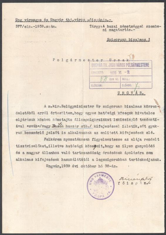1939 Ung vármegye főispánjának levele Ungvár város polgármestere részére, melyben figyelmezteti, hogy a hazai németséggel szemben ne használjanak lekicsinylő jelzőket (sváb, Basch-huszár)
