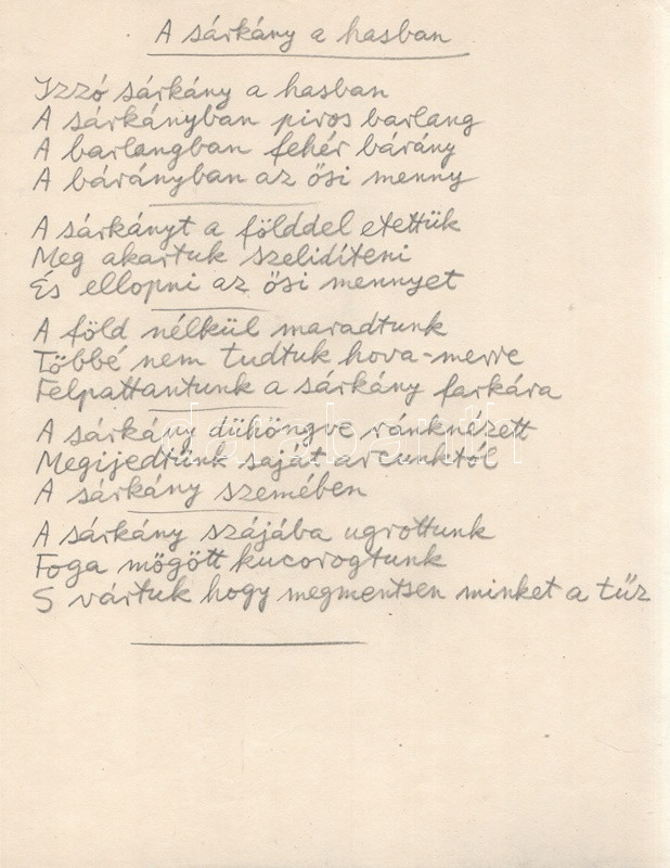Weöres Sándor (1913-1989) költÅ‘, Ãró ,,A sárkány a hasban" cÃmű műfordÃtásának saját kézzel, ceruzával Ãrt teljes kézirata. A fordÃtás Vasko Popa (1922-1991) román származású szerb költÅ‘ abszurd költeményérÅ‘l készült. Kelt: [Budapest, 1967]. Egy levél, mérete: 272x210 mm, egy beÃrt oldal. Az egy négysoros és négy háromsoros versszakból álló költemény Vasko Popa: Ostromlott derű (Európa Könyvkiadó, 1968.) cÃmű verseskötetének 168. oldalán, ,,A hárs a szÃv közepén" cÃmű, öt abszurd költeménybÅ‘l álló, egyszerre népi és szürreális hatásokat mutató ciklus második verseként jelent meg nyomtatásban. A kézirat szövege megegyezik a nyomtatásban megjelentével. Vasko Popa a legtöbbet fordÃtott szerb költÅ‘: 22 idegen nyelven 54 önálló kötete jelent meg. Kifogástalan, jó állapotú lap.