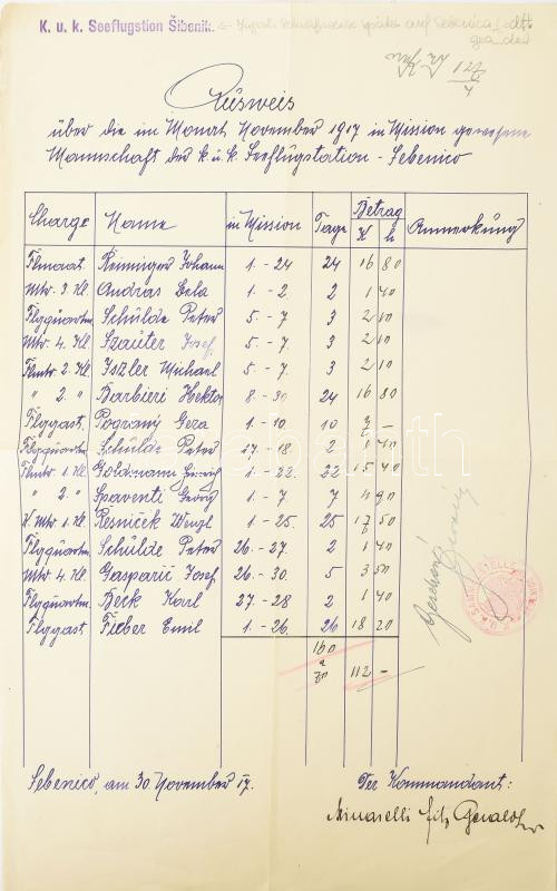 1917 Az osztrák-magyar Sibeniki repülőállomásának kézzel írt küldetési jelentése Baró Alfred von Minarelli-Fitzgerald parancsnok aláírásával, a repülőállomás pecsétjével / Extremely rare handwritten Mission Report by the Sebenico Flying Boat Station for the month of November, 1917. It is signed by station commander Linienschiffleutnant Baron Alfred von Minarelli-Fitzgerald K. u. K. Seeflugstation Šibenik and K.u.K. SAMMELSTELLE SEBENICO seals