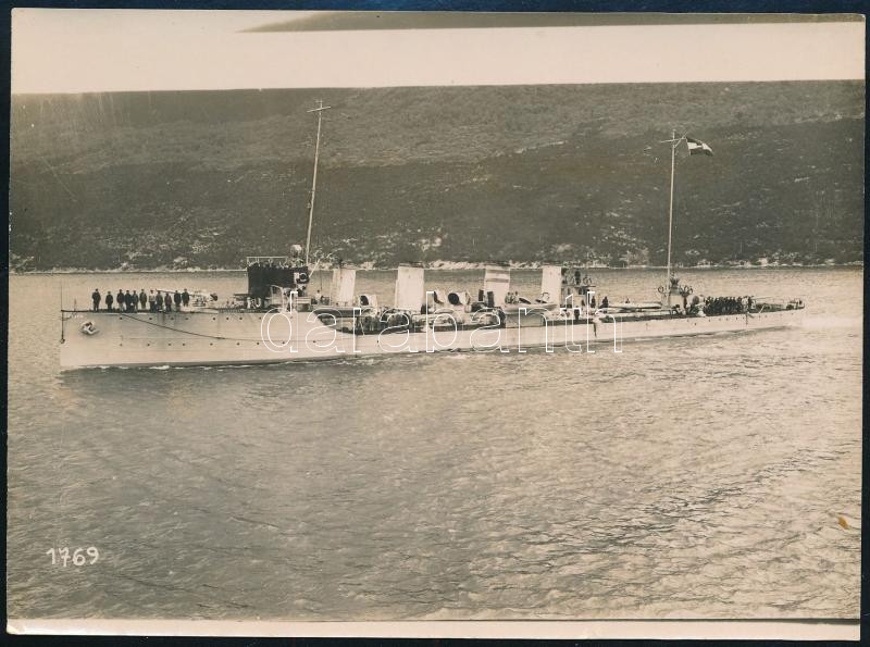 S.M.S. Orjen Ganz Danubius gyártású, Tátra osztályú osztrák-magyar romboló. Lassú sebességnél készült fotó egy másik hajóról. Feliratozott fotó 15x11 cm Szolgálati idő 1913-1937. / Black-and-white original photograph taken from a passing ship. S.M.S. Orjen is sailing at low speed. The crew has lined up on her portside as the other vessel sails past. Clear photograph showing the ship's guns and superstructure in sharp detail. Displacement: 1,050 tons. Crew: 105 Length: 279.8 feet; beam: 25.6 feet. Speed: 32.6 knots 2 10-cm cal. 50 guns, fore and aft 6 7-cm cal. 45 guns, three on each side 1 machine gun 4 torpedo tubes, mounted in pairs, two on each side