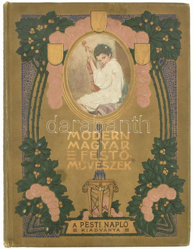 Modern magyar festőművészek. A modern magyar festészet fejlődése. A Pesti Napló előfizetőinek készült kiadás. (Bp., 1905), Pesti Napló (Hornyánszky Viktor-ny.), 140 p.+ 10 (színes műmellékletek, feliratozott hártyapapírral) t. Gazdag szövegközi és egészoldalas képanyaggal illusztrálva; többek között Csók István, Fényes Adolf, Ferenczy Károly, Kernstock Károly, Mednyánszky László, Vaszary János és Magyar-Mannheimer Gusztáv munkáival. Kiadói szecessziós, aranyozott, festett egészvászon-kötés, Gottermayer-kötés, szecessziós díszítésű előzékekkel, kopott borítóval, az elülső tábla belsején a papír sérült, a címlapon ceruzás bejegyzésekkel.
