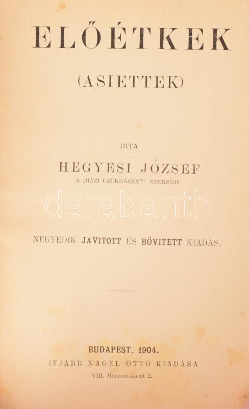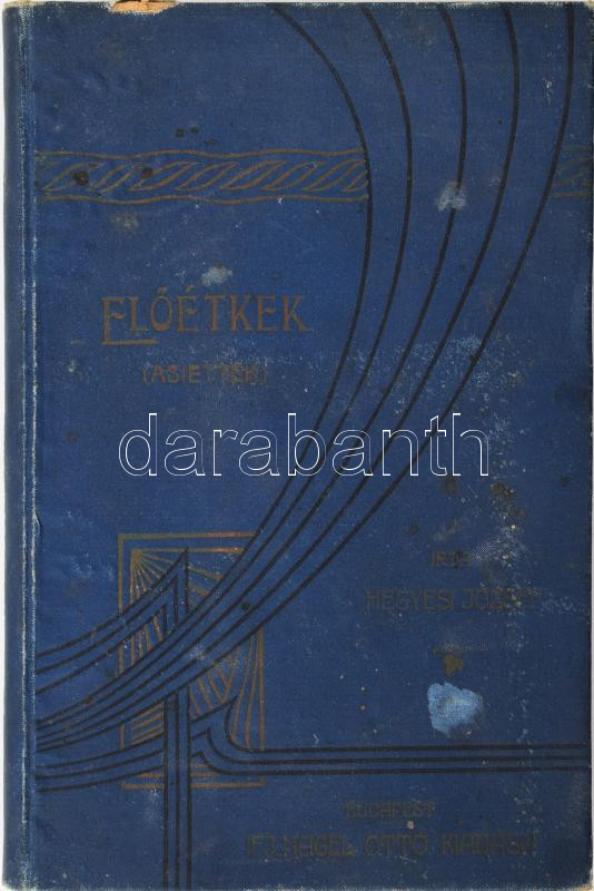Hegyesi József: Előétkek (Asietten). Bp.,1904, Ifjabb Nágel Ottó, (Newald Illés-ny.), 159+5 p. Negyedik, javított és bővített kiadás. Kiadói art-deco-s egészvászon-kötés, Leszik Károly-kötés, kopott, foltos borítóval, foltos lapokkal.