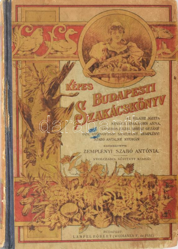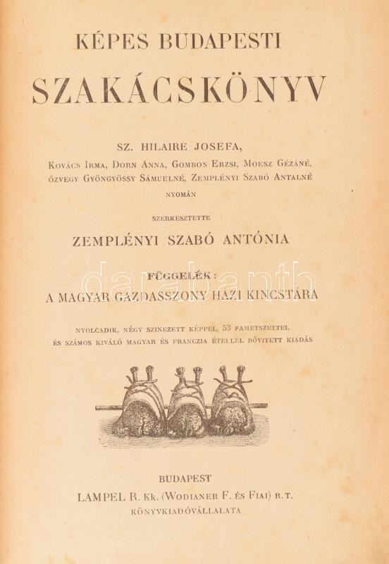 Zemplényi Szabó Antónia: Képes budapesti szakácskönyv. Sz. Hilaire Josefa, Kovács Irma, Dorn Anna, Gombos Erzsi, Moesz Gézáné, özvegy Gyöngyössy Sámuelné, Zemplényi Szabó Antalné nyomán szerkesztette: - -. Függelék: a Magyar gazdasszony házi kincstára c. munkával. Nyolcadik, négy színezett képpel, 53 fametszettel és számos kiváló magyar és franczia étellel bővített kiadás. Bp.,[1909, Lampel R. (Wodianer F. és Fiai) Rt., VIII+543+1+15 p.+4 t. Kiadói illusztrált félvászon-kötés, kopott borítóval, a gerincen sérüléssel, laza, kissé kijáró lapokkal (311-314), foltos elülső szennylappal.