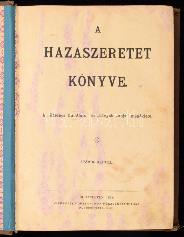 Description: A "Hazaszeretet Könyve." A "Hasznos Mulattató" és "Lányok Lapja" melléklete. Számos képpel. Bp., 1898, Werbőczy, 378+VI p. Gazdag képanyaggal illusztrált. Átkötött egészvászon-kötés, kopott, foltos borítóval, sérült gerinccel, foltos lapokkal.