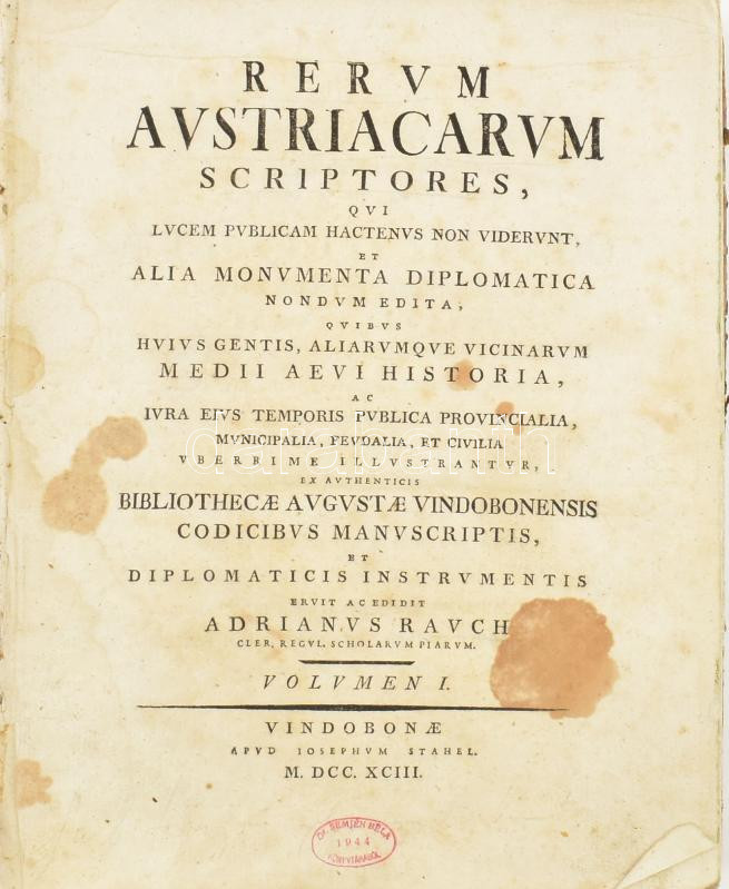 Adrianus Rauch: Rerum Austriacarum Scriptores, qui lucem publicam hactenus non viderunt, et alia monumenta diplomatica nondum edita, quibus huius gentis aliarumque vicinarum medii aevi historia ac iura eius temporis publica provincialia, municipiala, feudalia et civilia uberrime illustrantur, ex authenticis bibliothecae augustae Vindobonensis, codicibus manuscriptis et diplomaticis instrumentis eruit ac edidit - -. Volumen I. Vindobonae, 1793, Apud Josephum Stahel, 16+544 p. Latin nyelven. Korabeli félbőr-kötésben, kopott borítóval, foltos lapokkal, egy lap sarkán hiánnyal, néhány kisebb lapszéli sérüléssel.