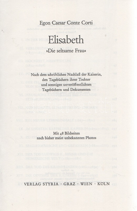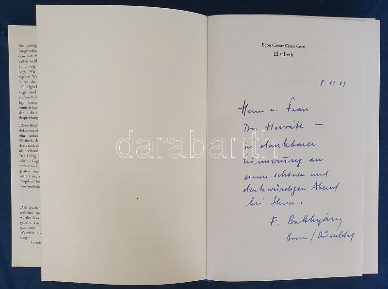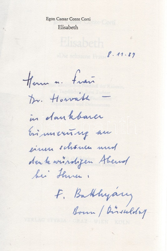 Corti, Egon Caesar: Elisabeth. ,,Die seltsame Frau". Nach dem schriftlichen Nachlass der Kaiserin, den Tagebüchern ihrer Tochter und sonstigen unveröffentlichen Tagebüchern und Dokumenten. (Batthyány László, a 9. Batthyány-herceg ajándékozási bejegyzésével.) Graz-Wien-Köln, 1987. Verlag Styria. 478 + [2] p. + 24 t. (kétoldalas). Ajándékozási bejegyzés: ,,Herr u. Frau dr. Horváth - in dankbaren Erinnerung an einen schönen und denkwürdigen Abend bei Ihnen. F[ürst] Batthyány. Bonn / Düsseldorf". Az ajándékozási bejegyzés szerzője a történelmi Batthyány-család grófi ágából származó gróf Batthyány László (1938-2015) máltai lovag, pápai titkos kamarás, apja halálától, 1966-tól a hercegi cím birtokosa. Prov: Horváth István (sz. 1943) közgazdász, külkereskedő, 1983-tól hágai, 1984-1991 között bonni nagykövet, a Nyugat felé való gazdasági és diplomáciai nyitás szakértője, valamint felesége. Aranyozott gerincű kiadói egészvászon kötésben, színes, illusztrált kiadói védőborítóban. Jó példány.