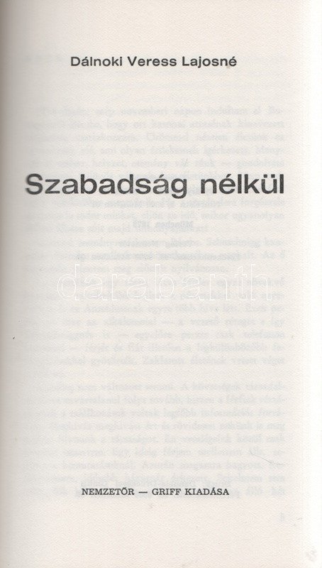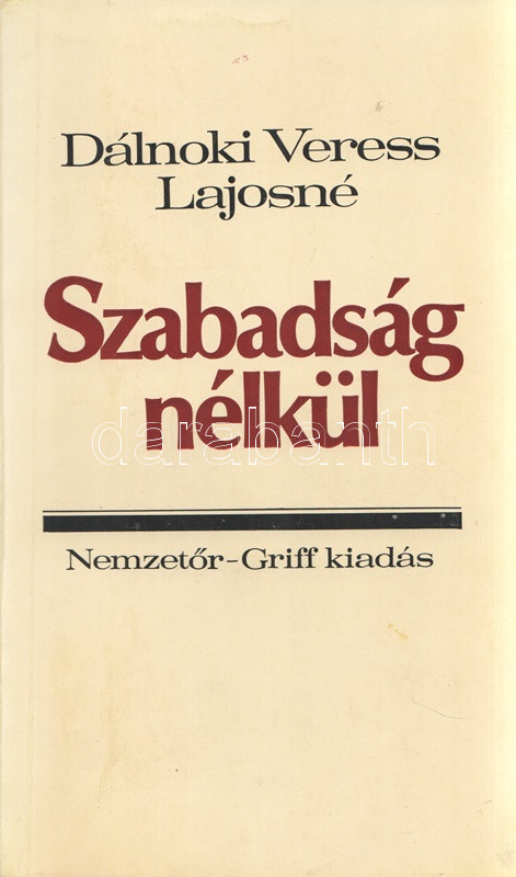 Dálnoki Veress Lajosné: Szabadság nélkül. [Emlékiratok.] (München, 1978). Nemzetőr - Ujváry Griff Verlag (Druck: Danubia-Druckerei GmbH). 167 + [1] p. Egyetlen kiadás. Emlékirat Dálnoki Veress Lajos (1889-1976) honvéd vezérezredesről bécsi katonai attasé korától második világháborús majd második világháború utáni éveiig. A doni páncéloshadosztály parancsnoka a kiugrási kísérletben is kiemelt szereppel bírt, azt követően a Gestapo letartóztatta, sopronkőhidai börtönéből megszökött. 1946-ban nyugdíjazták, 1947-ben koholt vádak alapján letartóztatták, 1956-ban szabadult, majd a forradalom végén nyugatra menekült. Onnantól döntően Londonban élt, ahol a Magyar Szabadságharcos Világszövetségének elnöki tisztségét is betöltötte. Fűzve, kiadói borítóban. Jó példány.