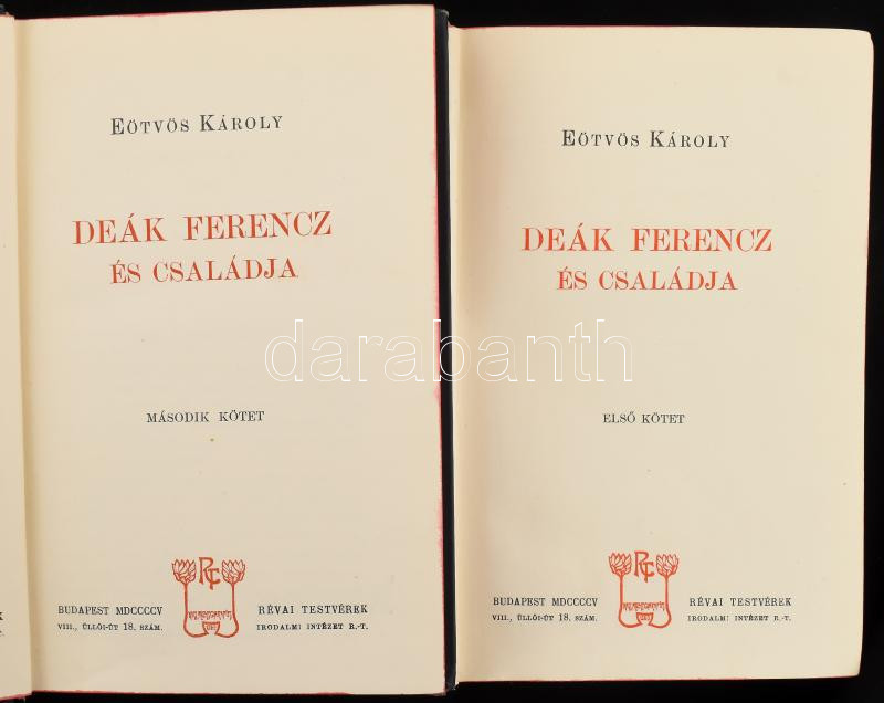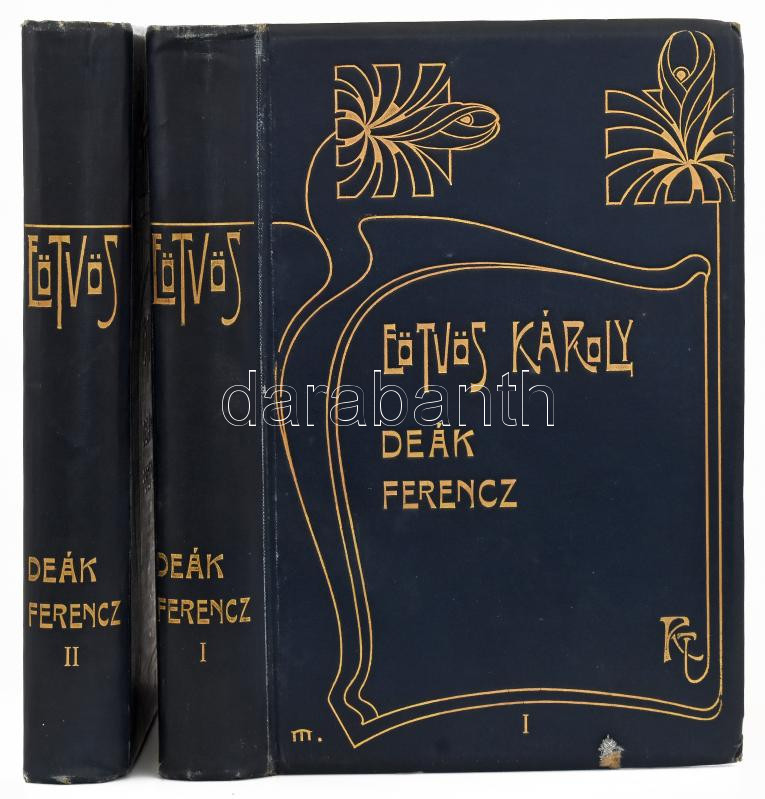 Eötvös Károly: Deák Ferencz és családja. I-II. köt. Eötvös Károly Munkái XIII-XIV. Bp., [1905], Révai. Kiadói aranyozott, dombornyomott, szecessziós egészvászon-kötés, Gottermayer-kötés, festett lapélekkel, a borÃtón minimális kopással,