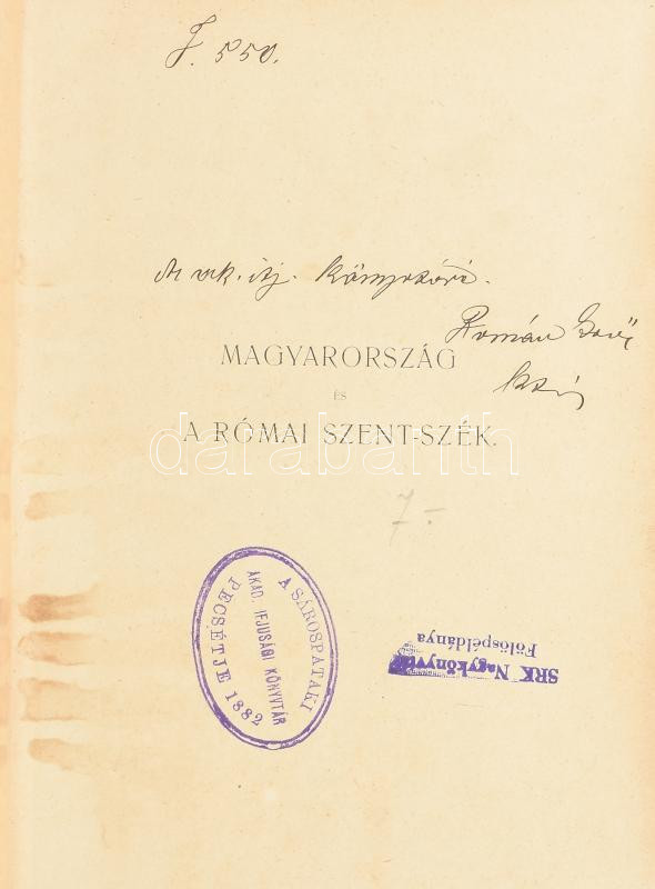 Fraknói Vilmos: Magyarország egyházi és politikai összeköttetései a Római Szent-Székkel a konstanczi zsinattól a mohácsi vészig. Budapest, 1902. Szent-István-Társulat Tud. és Irod. Osztálya (Stephaneum ny.) IX + [1] + 489 + [1] p. Első kiadás. Fraknói Vilmos történettudós háromkötetes diplomáciatörténeti munkájának önmagában is megálló, második része a levéltári kutatásokon alapuló, mégis komoly szépírói erényeket felmutató pozitivista történetírás szép példája. A dolgozat a késő középkori Magyarország (1418-1526) politikai és egyházi kapcsolatait mutatja be, a pápai legátusok, követek, a magyar egyházfők és a királyok egymásnak írt okmányain keresztül.Korabeli aranyozott félvászon kötésben