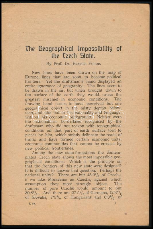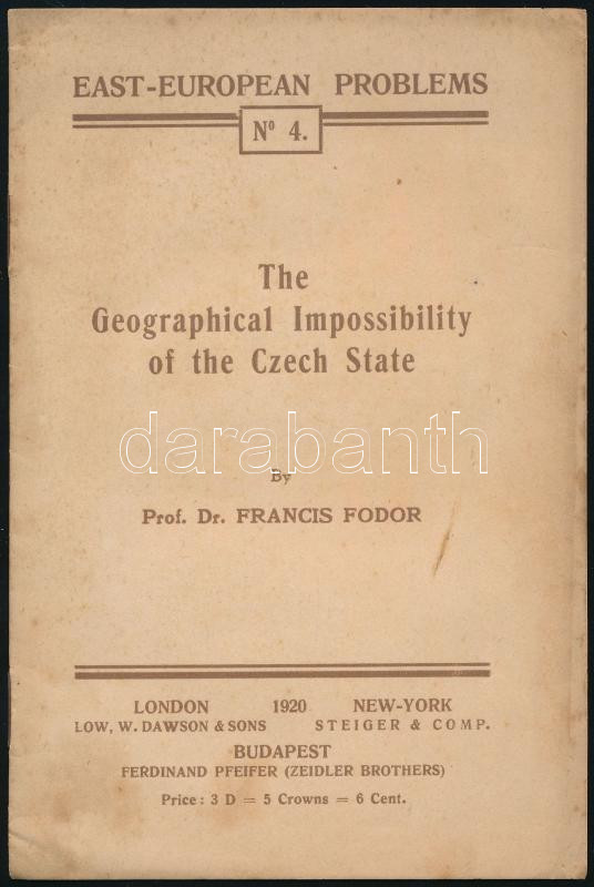 Francis Fodor (Fodor Ferenc): The Geographical Impossibility of the Czech State. East-European Problems No.4. London-New York-Bp., 1920, Low, W.Dawson & Sons - Steiger & Comp. - Ferdinand Pfeifer (Zeidler Brothers), 11 p (1 oldalszámozáson belüli térképpel). Angol nyelven. Kiadói papírkötés, kissé foltos borítóval, máskülönben jó állapotban. Ritka! / English languague, paper binding, slightly stained, otherwise in good condition. Rare!