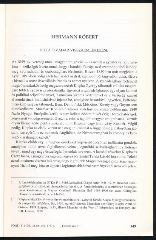 Description: Hermann Róbert: Duka Tivadar visszaemlékezése. Különlenyomat a FONS (Forráskutatás és Történeti Segédtudományok) IV. (1997) 2. számából. H.n., é.n., magánkiadás, 149-178 p. Tűzött papírkötés. A szerző, Hermann Róbert (1963- ) történész által DEDIKÁLT (Dr. Szele Lajosnak).