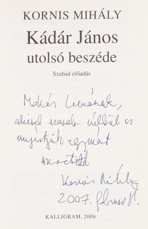 Kornis Mihály: Kádár János utolsó beszéde. A szerző, Kornis Mihály (1949-) József Attila-díjas író, drámaíró által Mohás Lívia (1928-2024) pszichológus, József Attila-díjas író részére DEDIKÁLT példány. Pozsony- Bp., 2006, Kalligram. Mellékelve Kádár János utolsó beszédének eredeti hangfelvétele CD-mellékleten. Kiadói kartonált papírkötés, kiadói papír védőborítóban.