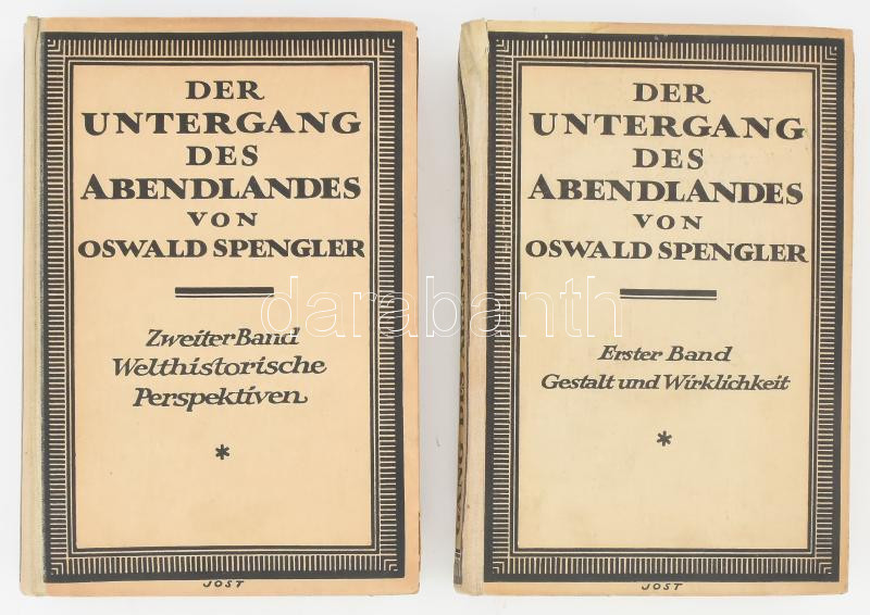 Spengler, Oswald: Der Untergang des Abendlandes. [A Nyugat alkonya. I-II. kötet.] Umrisse einer Morphologie der Weltgeschichte. Erster Band: Gestalt und Wirklichkeit. Zweiter Band: Welthistorische Perspektiven. München, 1920-1922., Oskar Beck,VIII+ 615+9 p.; VII+635+12 p. Sechste, Unveränderte Auflage. Német nyelven. Kiadói félvászon-kötés, kissé foltos, kissé kopott borítóval, az I. kötet sérült gerinccel. Oswald Spengler (1880-1936) német idealista filozófus fő műve. Szemléletváltoztató munkájának első kötete 1918 tavaszán jelent meg, néhány hónappal a Német Császárság katonai és politikai összeomlása előtt, második kötete pedig 1922-ben. ,,A Nyugat alkonya"-ként ismert történetfilozófiai munka szakít a történeti elbeszélések uralkodó, liberális modelljével, mely szerint minden fejlődés csúcsa az európai kultúra, azon belül is a nyugati típusú kultúra: saját társadalmára a megmerevedett, gépszerűségbe fulladó civilizáció mintapéldányaként tekint, amelyben a technikai fejlődés már csak ideig-óráig képes feltartóztatni az elkerülhetetlen degenerálódást. Spengler művének egyik nagy újítása a kultúrkörök elméletének kidolgozása, véleménye szerint a kultúrkörök között nincs rangsorrend, és sorsukhoz elkerülhetetlenül hozzátartozik, hogy fejlődésük zenitjén túljutva kiüresednek. A kétkötetes munka rengeteg párhuzamot mutat be az antik civilizáció és a jelenkori nyugati civilizáció pályaíve között, és úgy értékeli, hogy a nyugati civilizáció éppolyan válságtüneteket mutat, mint minden korábbi elbukott civilizáció. A Nyugat alkonyának óriási hatása volt kora szellemi életére, Európa-szerte és Magyarországon is, Hamvas Béla, Szerb Antal és Németh László életműve elképzelhetetlen a spengleri mű hatása nélkül. A teljes magyar fordítás csupán 1994-ben látott napvilágot.