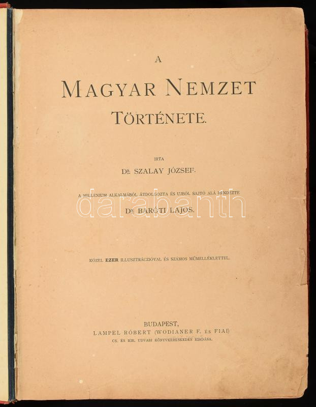 Szalay József - Baróti Lajos: A magyar nemzet története. III. köt: Magyarország a Habsburg-házból való választott királyok korában. 325 szövegképpel és 29 műmelléklettel. Bp., én., Lampel Róbert (Wodianer F. és Fiai). Rendkívül gazdag szövegközi és egészoldalas illusztrációval, térképekkel, kihajtható mellékletekkel. Kiadói dúsan aranyozott, festett, félbőr-kötés, kopott borítóval, kopott borítóval és gerinccel.