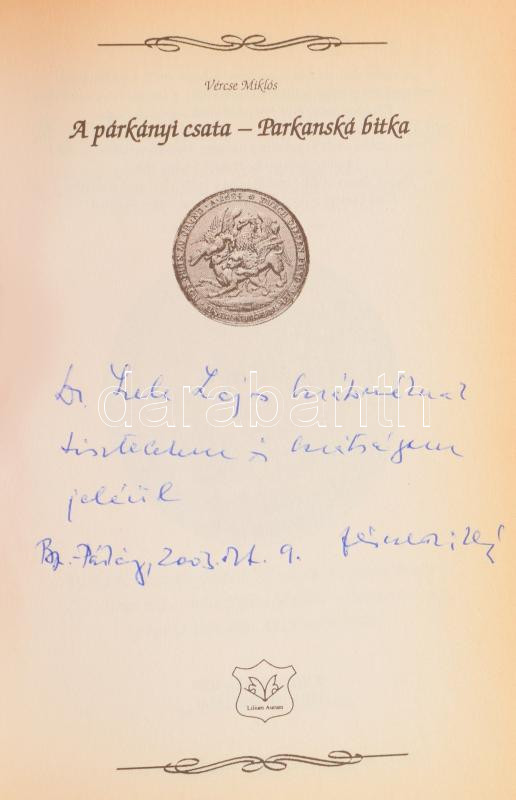 Vércse Miklós: A párkányi csata. Parkanská bitka. DEDIKÁLT! Dunaszerdahely/ Dunajská Streda, 2003, Lilium Aurum. Kiadói papírkötés.