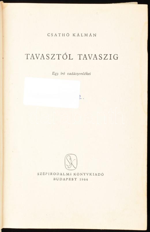 https://www.darabanth.com/en/469-Online-auction/469.0/Books/Books-Hunting~1000024/Csatho-Kalman-Tavasztol-tavaszig-Egy-iro-vadaszemlekei-Bp-1964-Szepirodalmi-Kiadoi~II3151255