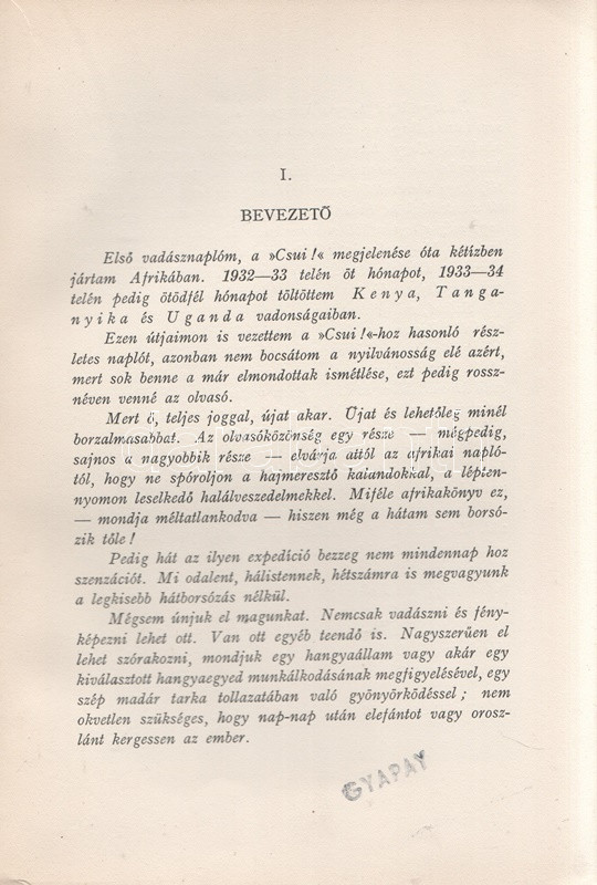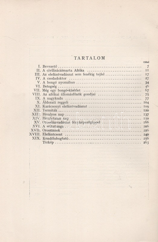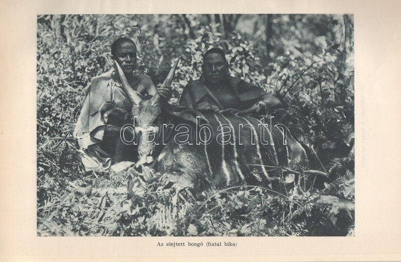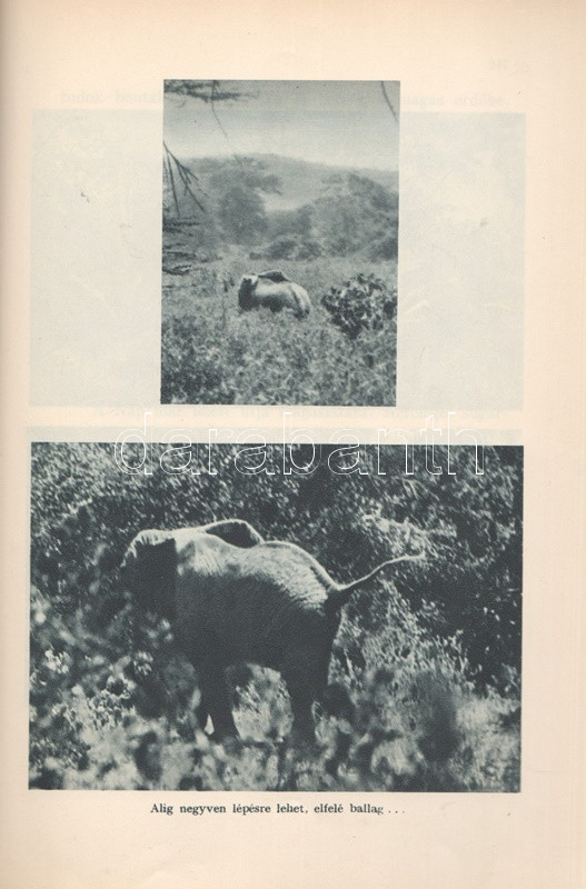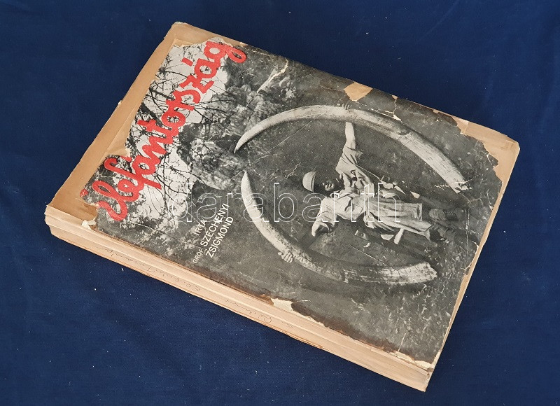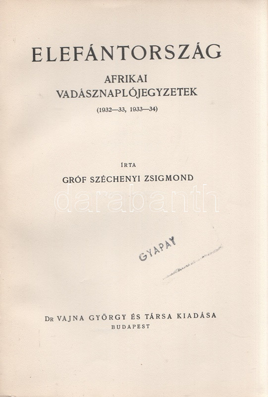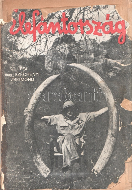 Széchenyi Zsigmond: Elefántország. Afrikai vadásznaplójegyzetek (1932-33, 1933-34). Budapest, (1934). Vajda György és Társa (Athenaeum Rt. ny.) 260 + [12] p. + 1 térkép (dupla oldalas). Első kiadás. Széchenyi Zsigmond (1898-1967) vadászíró 1927-1938 között hét alkalommal vadászott Afrika különböző tájain. Ebben a könyvében sorrendben második és harmadik kenyai szafarivadászata beszámolóját nyújtja, oldalszámozáson belül 46 kétoldalas táblával, valamennyi táblán fotóanyaggal. Az első előzéken afrikai asszonyokat ábrázoló, dupla oldalas zsánerkép, az első nyomtatott oldalon, a címlapon és a belív számos oldalán régi tulajdonosi bélyegzés. Vuray 721. Tordai 1280. Fűzve, gerincén és első borítóján kézi feliratozású, javított korabeli borítóban. Példányunkhoz tartozik a mű illusztrált kiadói első borítófedele, apró hiányokkal.
