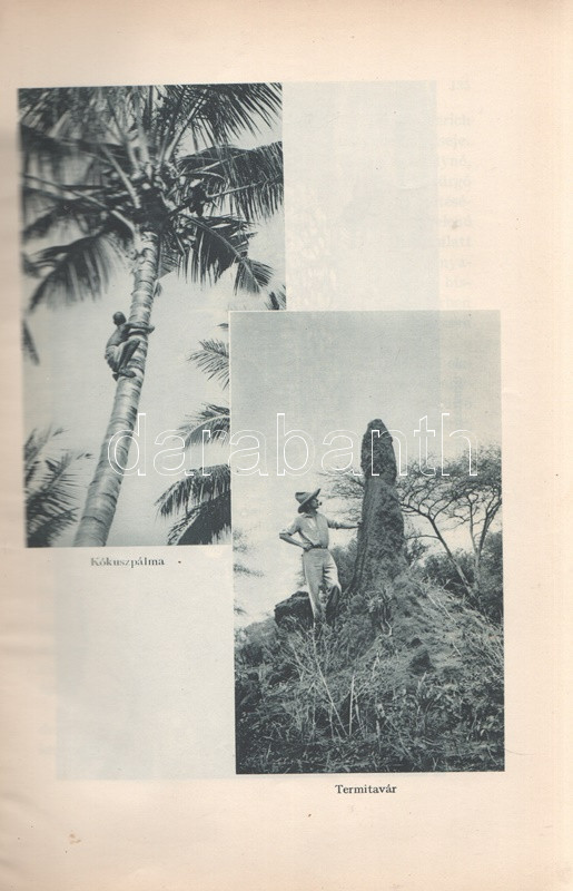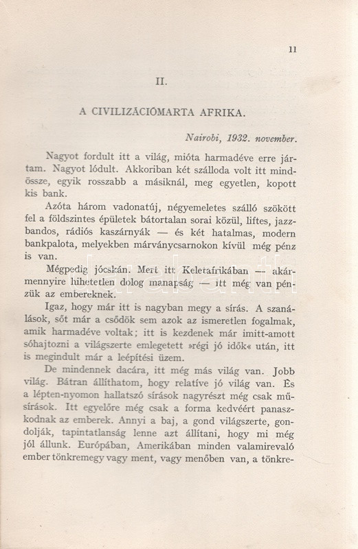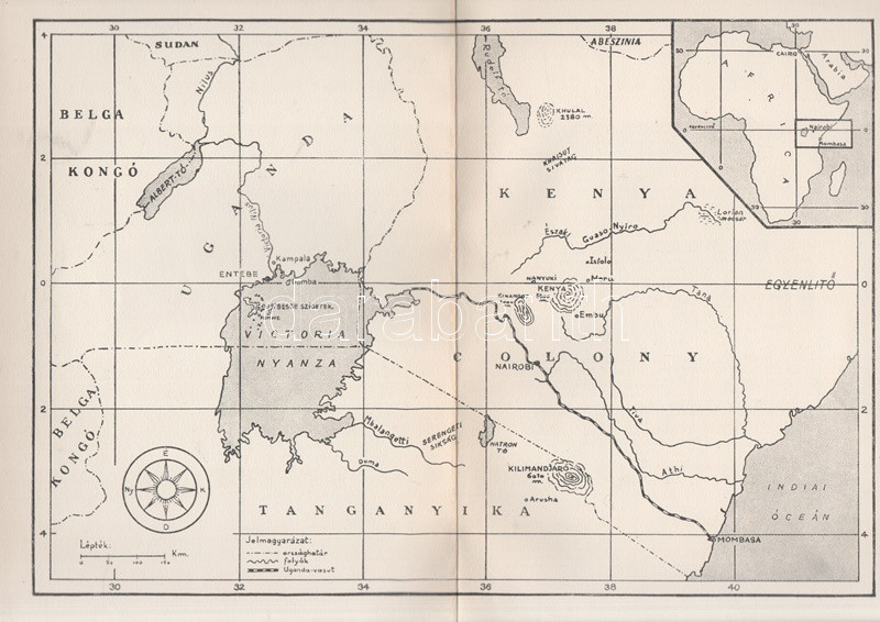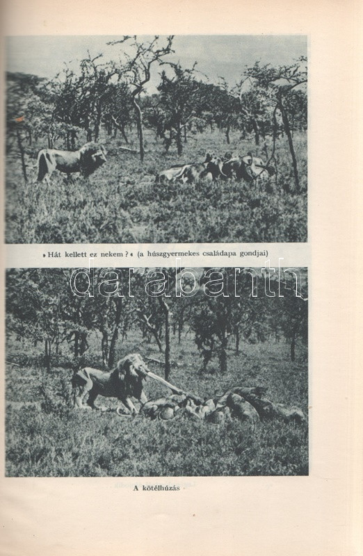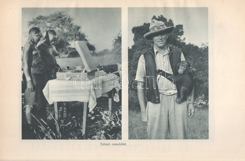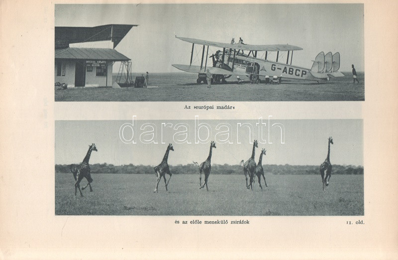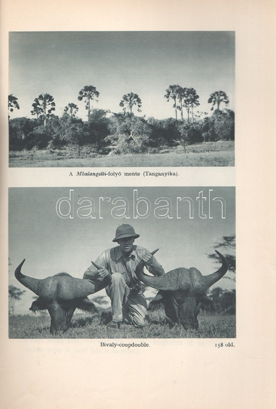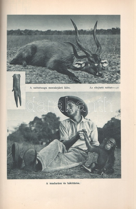 Széchenyi Zsigmond: Elefántország. Afrikai vadásznaplójegyzetek (1932-33, 1933-34). Budapest, (1934). Vajda György és Társa (Athenaeum Rt. ny.) 260 + [12] p. + 1 térkép (dupla oldalas). Első kiadás. Széchenyi Zsigmond (1898-1967) vadászíró 1927-1938 között hét alkalommal vadászott Afrika különböző tájain. Ebben a könyvében sorrendben második és harmadik kenyai szafarivadászata beszámolóját nyújtja, oldalszámozáson belül 46 kétoldalas táblával, valamennyi táblán fotóanyaggal. Az első előzéken afrikai asszonyokat ábrázoló, dupla oldalas zsánerkép, az első nyomtatott oldalon, a címlapon és a belív számos oldalán régi tulajdonosi bélyegzés. Vuray 721. Tordai 1280. Fűzve, gerincén és első borítóján kézi feliratozású, javított korabeli borítóban. Példányunkhoz tartozik a mű illusztrált kiadói első borítófedele, apró hiányokkal.