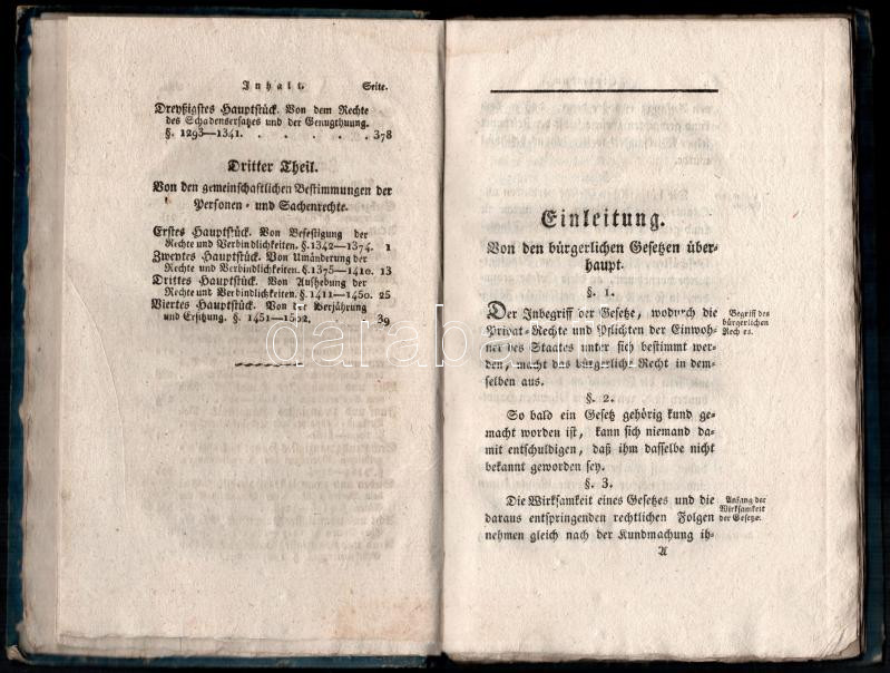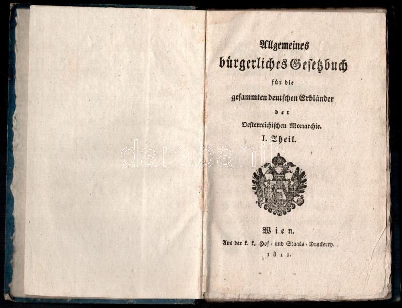 Wien, 1811, Aus der k. k. Hof- und Staatsdruckerei, I. és III. kötet, regiszterrel (Töredék) 110 p., 66 p. + Alphabetisches Register über den Inhalt der drey Theile des allgemeinen bürgelichen Gesetzbuches... Wien, 1811. u.o. Korabeli papírkötésben, felvágatlan. / 2nd volume missing. In paper binding. Uncut
