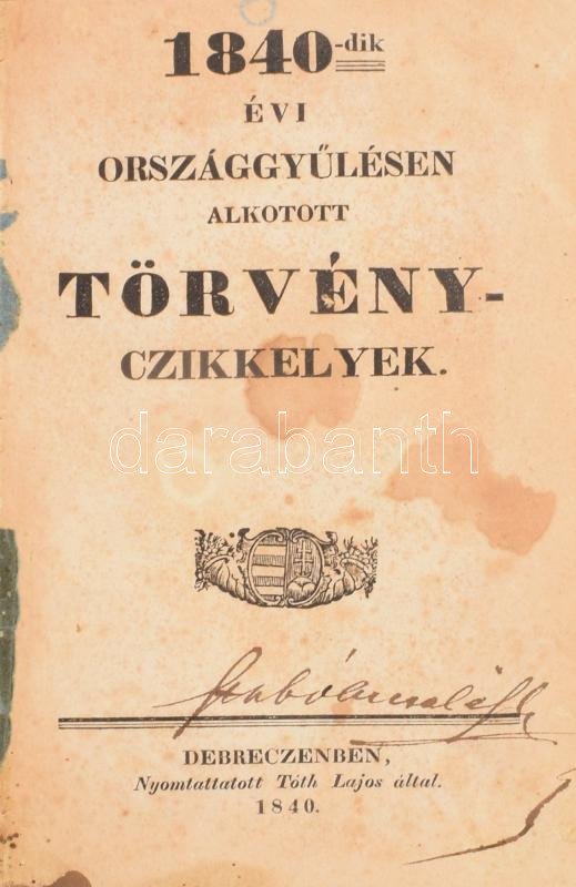 https://www.darabanth.com/en/469-Online-auction/469.0/Books/Books-Law~1000019/Az-1840-dik-evi-magyar-orszaggyulesen-alkotott-torveny-czikkelyek-Debreczenben-1840-Toth-~II3176145