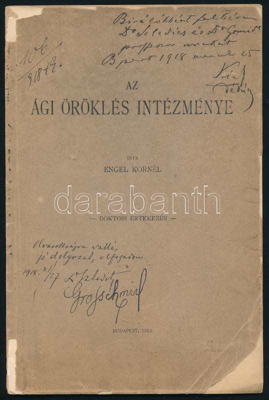 Engel Kornél: Az ági öröklés intézménye. Doktori értekezés. Bp., 1918., hiányos papírkötés. professzor elfogadó jegyzetével.