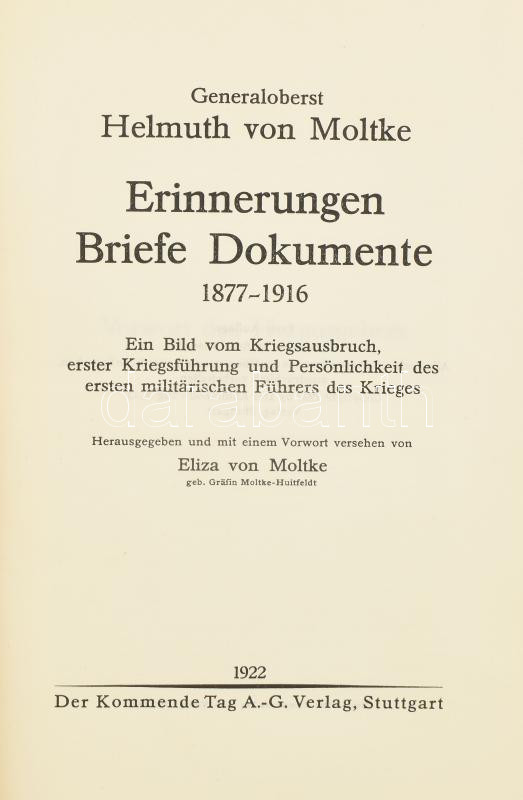 Description: Generaloberst Helmuth von Moltke: Erinnerungen Briefe Dokumente 1877-1916. Ein Bild vom Kriegsausbruch, erster Kriegsührung und Persönlichkeit des ersten militärischen Führers des Kriegses. Hrsg. und mit einem Vorwort versehen von Eliza von Moltke. Stutttgart, 1922, Der Kommende Tag A.-G. Verlag. Német nyelven. Félvászon-kötésben.
