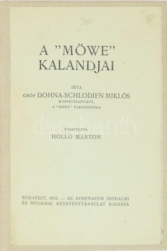 Gróf Dohna-Schlodien Miklós: A "Möwe" kalandjai. Ford.: Holló Márton. Bp., 1916, Athenaeum, 100 p.+ 8 (fekete-fehér képek) t. Első kiadás. Átkötött egészvászon-kötésben, helyenként kissé foltos lapokkal.