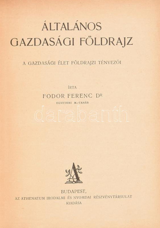 Fodor Ferenc: Általános gazdasági földrajz. A gazdasági élet földrajzi tényezői. Bp.,én., Athenaeum, 230+2 p. Átkötött félvászon-kötés.