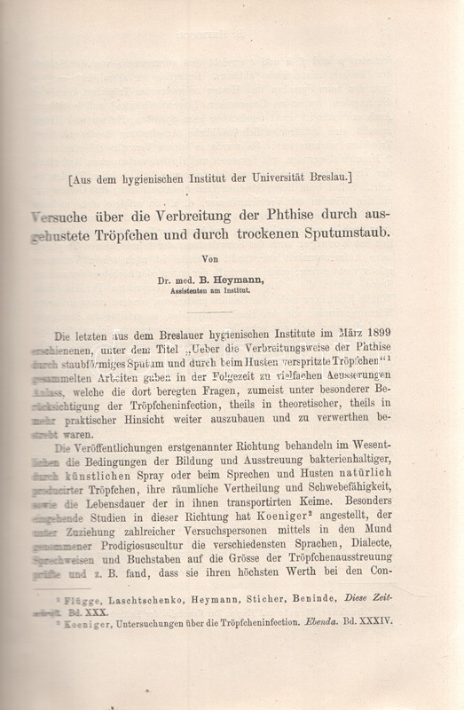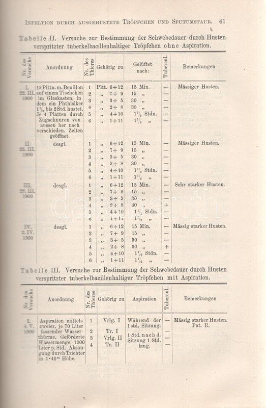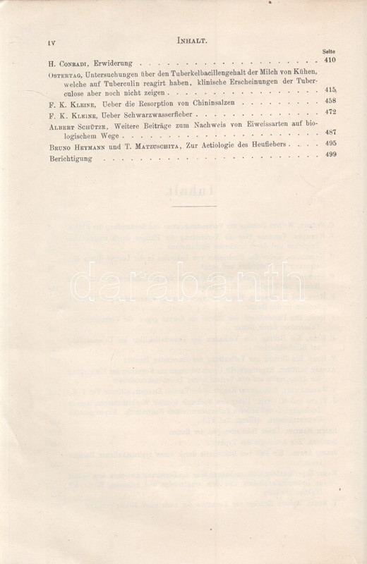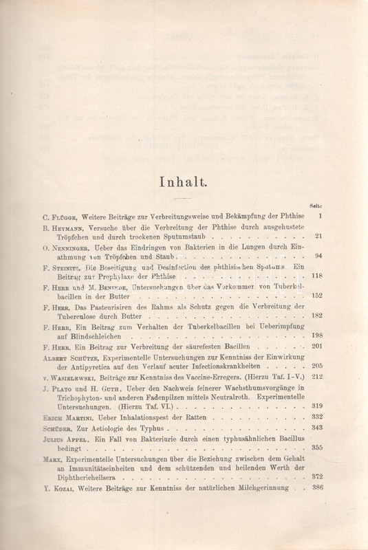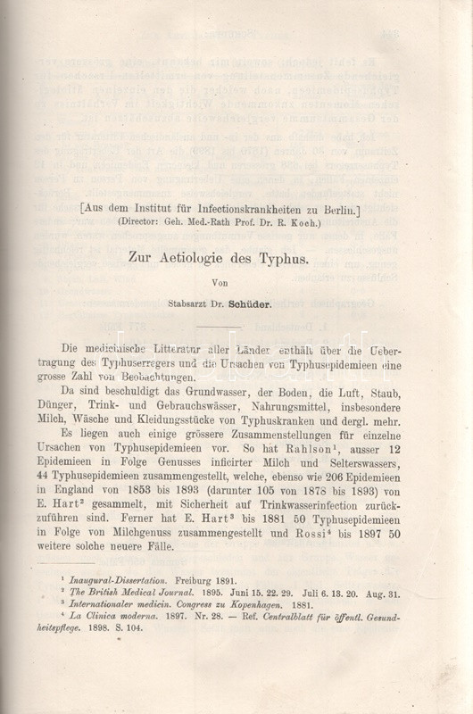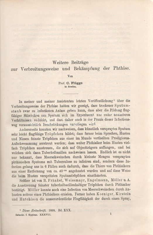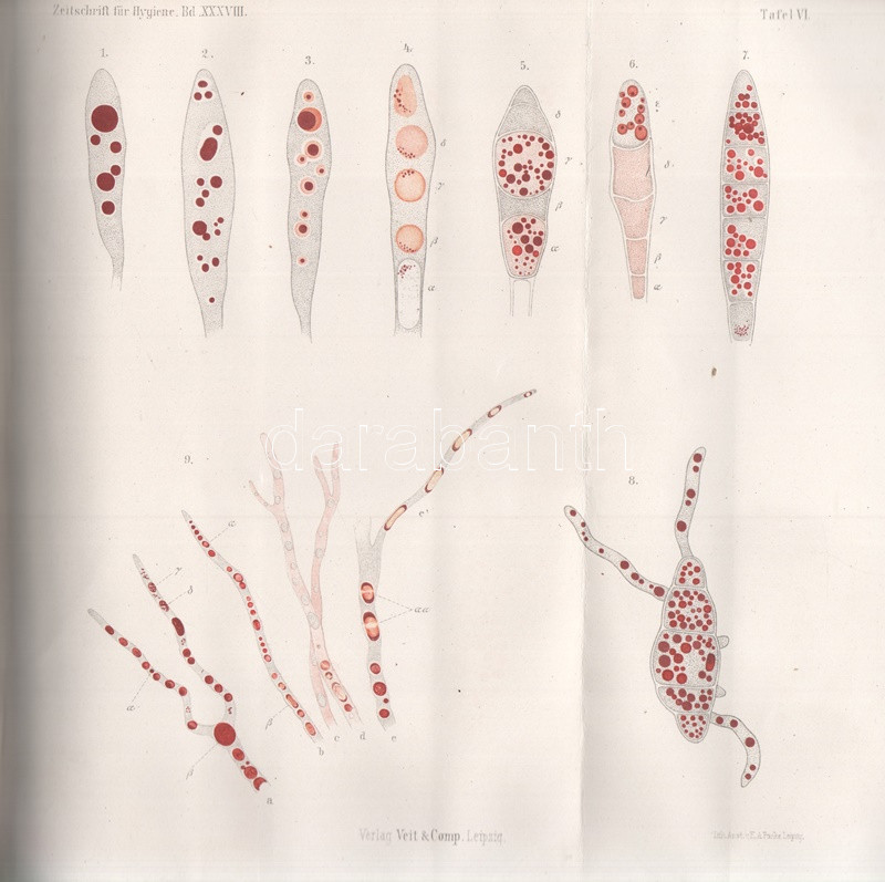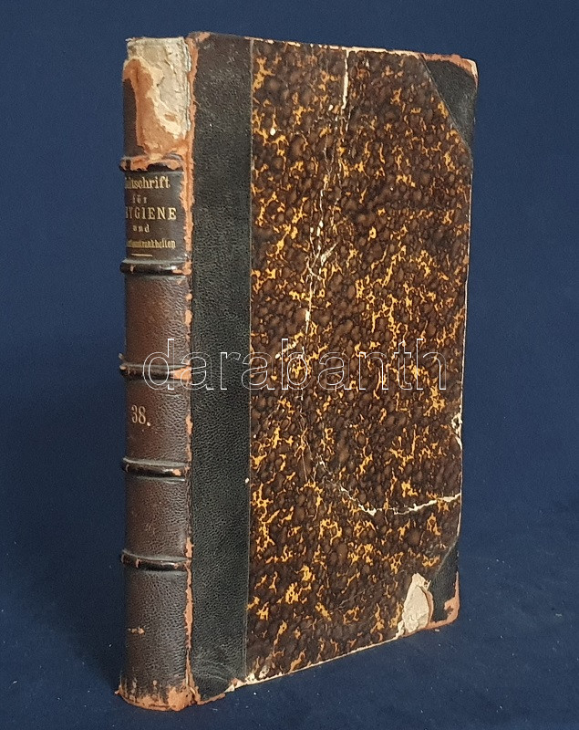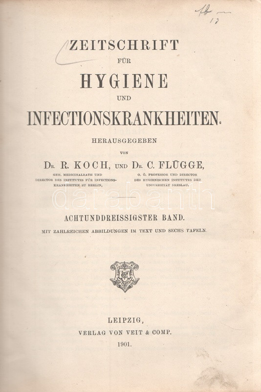 Koch, R[obert] - Flügge, C[arl] (herausg.): Zeitschrift für Hygiene und Infectionskrankheiten. Herausgegeben von R. Koch und C. Flügge. Achtunddreissigster Band. Mit zahlreichen Abbildungen im Text und sechs Tafeln. [Lipcse] Leipzig, 1901. Verlag von Veit und Comp (Druck von Metzger und Wittig). [4] + 499 + [1] p. + 6 t. (hártyapapírral védett táblák, 2 kihajtható, ebből egy színes). Robert Koch (1843-1910) német mikrobiológus és Carl Georg Flügge (1847-1923) bakteriológus együtt szerkesztették a nemzetközi hírű orvosi folyóiratot, a tuberkulózis, a kolera elleni védekezésben kulcsszerepet játszó ,,Zeitschrift für Hygiene und Infectionskrankheiten" című szaklapot. Az alapos bibliográfiával záruló tanulmányokból álló kötetet oldalszámozáson belül számos táblázat és néhány szövegközti ábra kíséri. Néhány oldalon aláhúzások, szövegkiemelések, a címoldalon apró, halvány foltosság. Aranyozott, álbordázott, kissé hiányos gerincű, enyhén sérült korabeli félbőr kötésben, márványmintás festésű lapszélekkel.