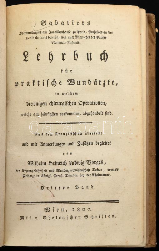 Sabatiers ... Lehrbuch Für praktische Wundärzte, in welchem diejenigen chirurgischen Operationen, welche am häufigsten vorkommen, abgehandelt sind. Erster Band, Dritter Band. Wien, 1800. Kiadói kartonált kötés, gerinc sérült, kopottas állapotban.