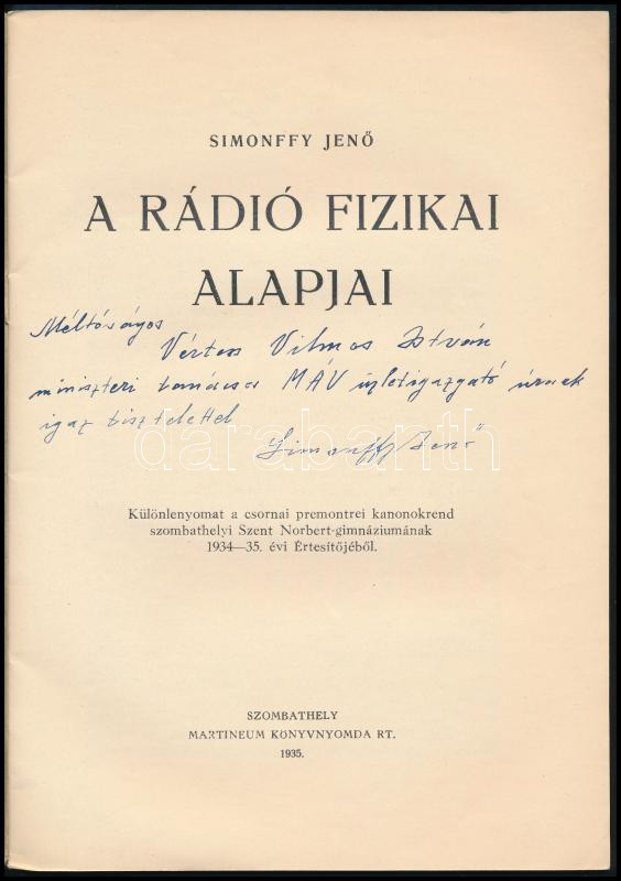 Simonffy Jenő: A rádió fizikai alapjai. A szerző, Simonffy Jenő (1885-1954) által DEDIKÁLT példány! Szombathely, 1935, Martineum. Kiadói papírkötés.