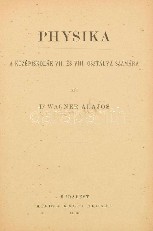 Wagner Alajos: Physika. A középiskolák VII. és VIII. osztálya számára. Bp., 1888., Nagel Bernát. Átkötött félvászon-kötés, kopott borítóval, ceruzás bejelölésekkel, aláhúzásokkal.