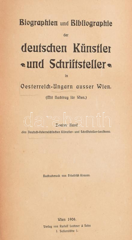 Reko, Viktor A. / Bohrmann, Heinr. d.J. (Hrsg.):Deutsch-Österreichisches Künstler- und Schriftsteller-Lexikon. Biographien und Bibliographie der deutschen Künstler und Schriftsteller in Oesterreich-Ungarn ausser Wien. (Mit Nachtrag für Wien.) Zweiter Band. Buchschmuck von Friedrich Krauss.. Bécs, 1906, Rudolf Lechner & Sohn. 388 p. Német nyelven Kiadói szecessziós, aranyozott, festett egészvászonkötésben, festett lapélekkel, gerincen és borítón apró kopásnyomokkal, címlapon ceruzás jelöléssel, jó állapotban. Csak a 2. kötet! A kötetben többek közt László Fülöp festőművész.