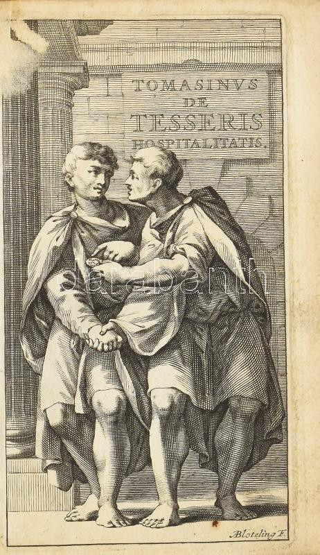 Tomasini, Jac[opo] Philippo (1597-1654) De tesseris hospitalitatis. Liber singularis, in quo hospitii universum, apud veteres potissimum expenditur. Amstelodami, 1670. Andrea Frisius. 5 sztl. lev. 227 l. 12 sztl. lev. 3 rézmetszetű t. (ebből 2 kihajtható), szövegközti rézmetszetekkel. Hozzákötve: Tomasini, Jac[opo] Philippo (1597-1654) Titus Livius Patavinus. Editio novissima... Amstelodami, 1670. Andrea Frisius. 125 l. 8 sztl. lev. 2 kihajtható rézmetszetű t. Korabeli, jó állapotú egészpergamen-kötésben.