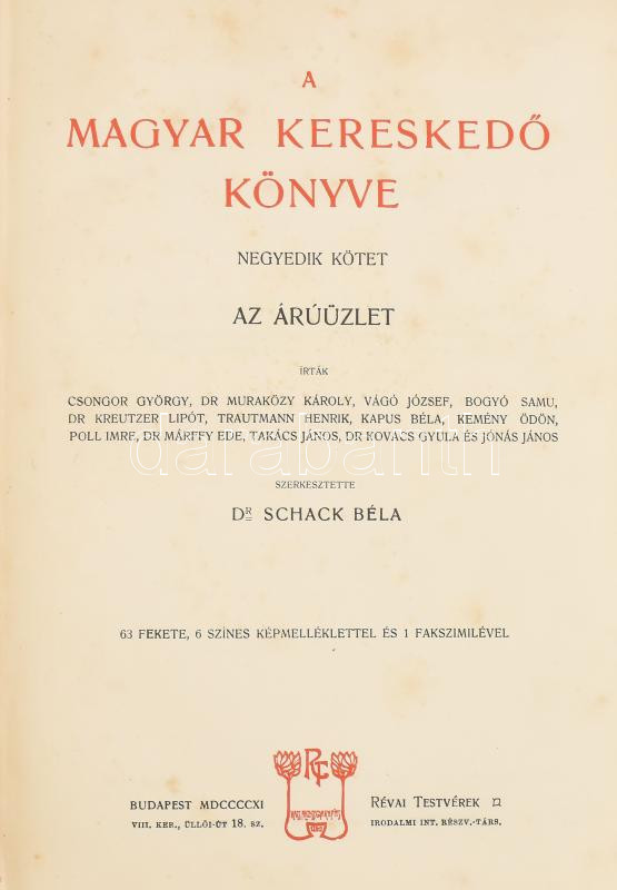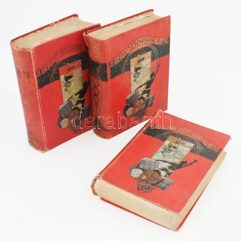A magyar kereskedÅ‘ könyve II-IV. köt. [Négy kötetben teljes.] Szerk.: Dr. Schack Béla. KereskedÅ‘k, pénzintézeti tisztviselÅ‘k, gyárosok, iparosok, bÃrák, ügyvédek és hivatalnokok számára. II.: A kereskedelmi üzletvitel. III.: Az értéküzlet. IV.: Az árúüzlet. Bp., 1907-1911, Révai. Egészoldalas képekkel illusztrálva. Kiadói festett, illusztrált egészvászon-kötés, Gottermayer-kötés, változó állapotban, kissé viseltes borÃtókkal, helyenként sérült, foltos lapokkal, néhány kijáró lappal, az egyik kötet sérült gerinccel.