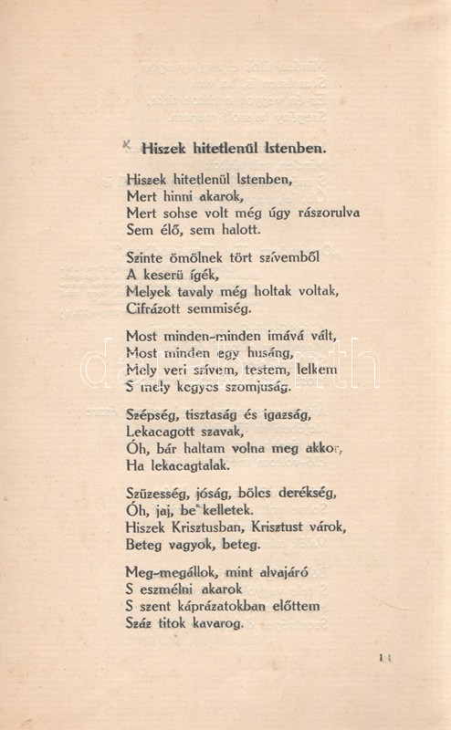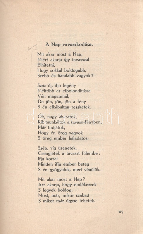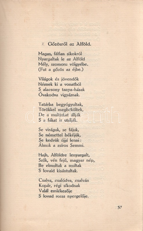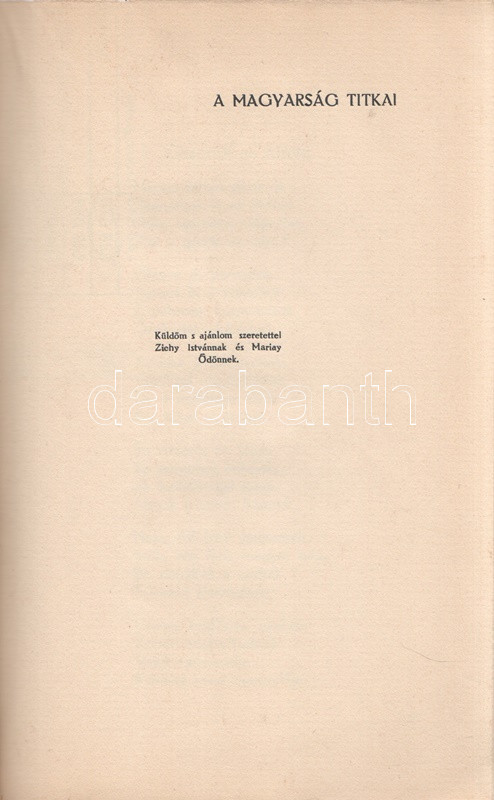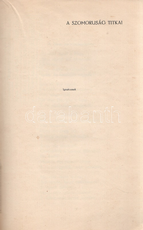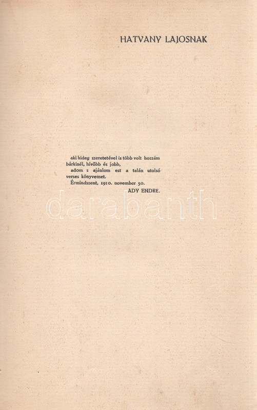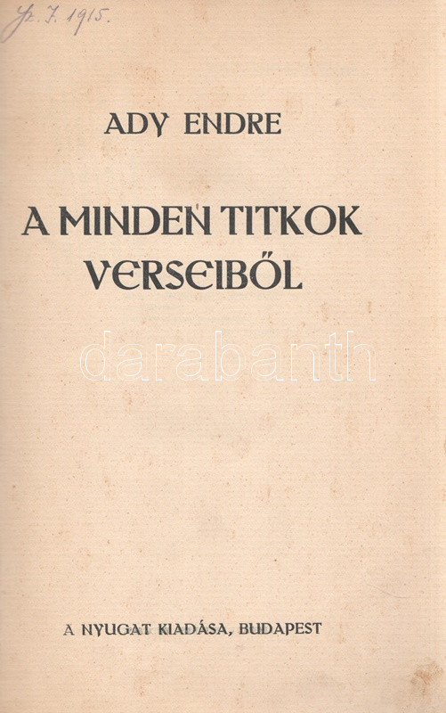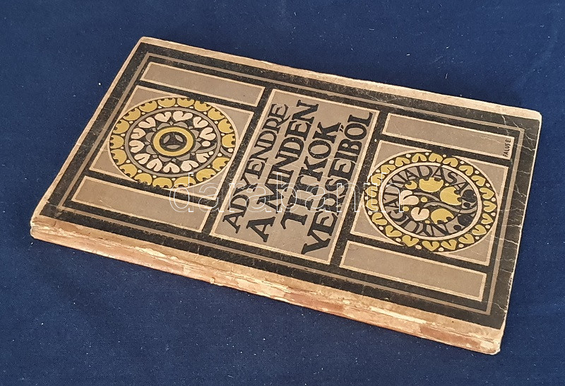 Ady Endre: A Minden Titkok verseiből. Budapest, (1910). A Nyugat kiadása (Légrády Testvérek ny.) 104 + [4] p. Első kiadás. Ady Endre a kötet ajánlásában a következő állítást teszi: ,,Hatvany Lajosnak, aki hideg szeretetével is több volt hozzám bárkinél, hívőbb és jobb, adom s ajánlom ezt a talán utolsó verses kötetemet. Érmindszent, 1910. november 30. Ady Endre". A különféle mecénásoknak és szerkesztőségi szövetségeseknek ajánlott kötetet a következő években számos verseskötet követte. Fűzve, Falus Elek színes rajzával illusztrált kiadói borítóban, a hátsó borítón kisebb foltosság. Körülvágatlan, jó példány.