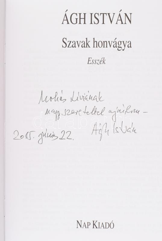 Ágh István: Szavak honvágya. Esszék. A szerző, Ágh István (1938-) Koss... https://www.darabanth.com/en/469-Online-auction/469.0/Books/Books-Other-rarities~2000025/Agh-Istvan-Szavak-honvagya-Esszek-A-szerzo-Agh-Istvan-1938-Kossuth-es-Jozsef-Attila~II3167695